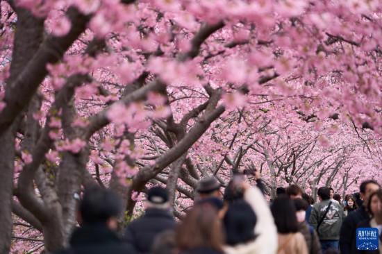 2月24日,游客們在日本靜岡縣河津町欣賞河津櫻。新華社記者 張笑宇 攝