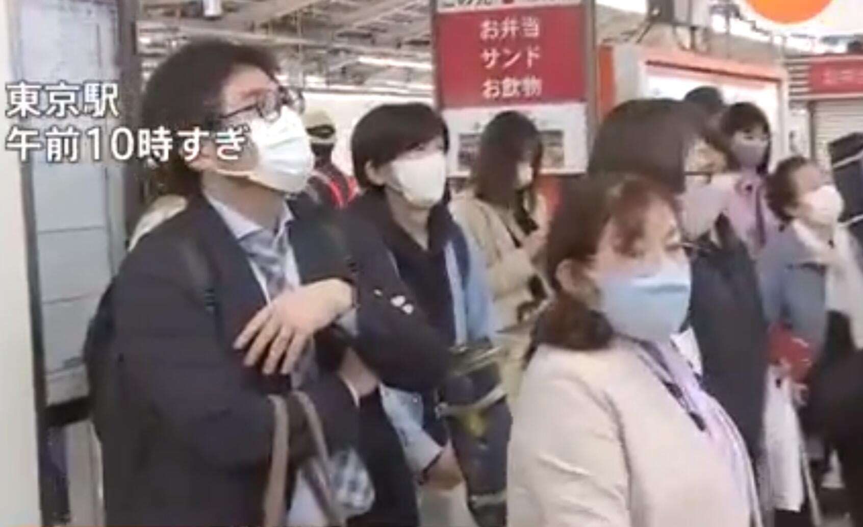 13日上午10點后的東京車站內,大多數乘客都戴著口罩。(視頻截圖)