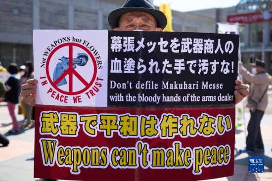 日本2023防務與安全設備國際博覽會15日在日本千葉縣幕張會展中心開幕。300多名民眾聚集在會展中心門前,強烈抗議日本強化武器交易的行徑。