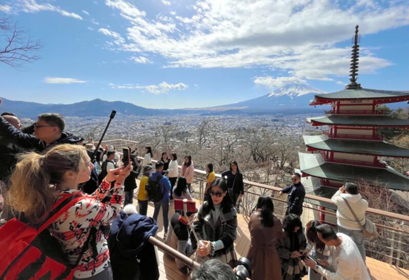 很多外國游客在新倉山淺間公園的觀景臺遠眺富士山。(圖片來源:《朝日新聞》)