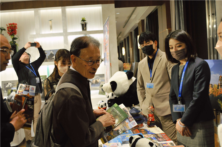 活動開始前,與會嘉賓紛紛在入口處的“熊貓友好交流之夜”留言墻上為回國的大熊貓家族送上祝福話語,并饒有興致地參觀了中國旅游推介展。