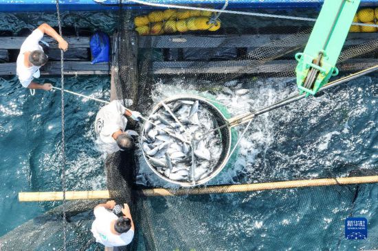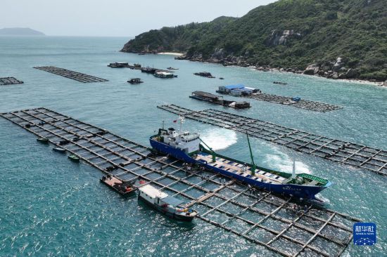 3月24日,在萬寧大洲島水域,漁民協助日本籍漁船裝運章雄魚苗(無人機照片) 。新華社記者 張麗蕓 攝