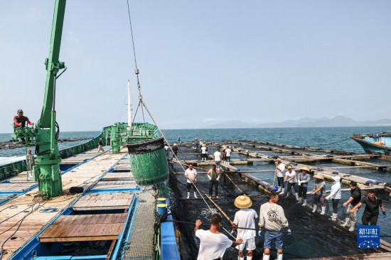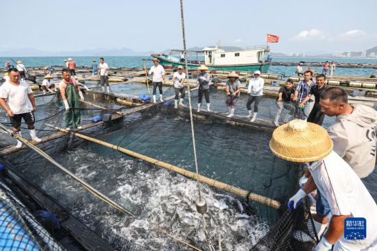 3月24日,在萬寧大洲島水域,漁民協助日本籍漁船裝運章雄魚苗。新華社記者 張麗蕓 攝