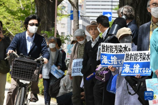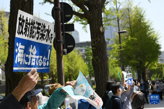 4月13日,在日本東京,民眾手舉標語在日本國會眾議院第二議員會館前參加集會抗議。新華社記者 岳晨星 攝