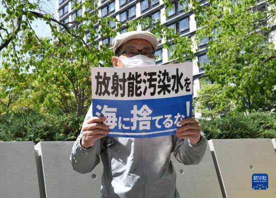 4月13日,在日本東京,一名男子手舉標語在日本國會眾議院第二議員會館前參加集會抗議。新華社記者 岳晨星 攝