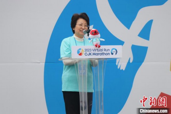 為了慶祝此次“2023中日韓線上馬拉松大賽”的成功啟動,活動現場還準備了與中日韓合作秘書處吉祥物合影的展臺,以及介紹歷屆馬拉松參賽選手的故事和東亞文化之都跑步路線的展板,希望通過體育展現中日韓合作的新面貌。