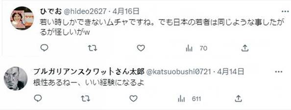 看過之后躍躍欲試的日本網友表示,“應該玩得很開心吧,旅行結束后的疲勞和充實感會特別好”“會成為10年后特別美好的笑談和回憶吧”“講真,看起來非常有趣,不過如果是日本,景色沒什么太多不同,感覺會無聊”。