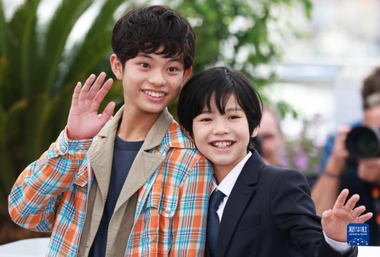 5月18日,在法國戛納舉行的第76屆戛納國際電影節上,日本小演員柊木陽太(右)和黑川想矢亮相影片《怪物》的拍照式。新華社記者 高靜 攝