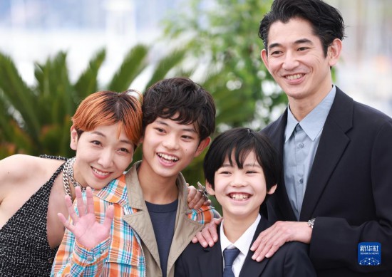 5月18日,在法國戛納舉行的第76屆戛納國際電影節上,日本演員安藤櫻、黑川想矢、柊木陽太和永山瑛太(從左至右)亮相影片《怪物》的拍照式。新華社記者 高靜 攝