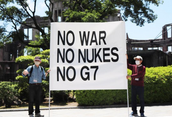 5月14日,在日本廣島和平紀念公園原子彈轟炸遺址前,日本民眾舉著“不要戰爭、不要核武器、不要G7”等標語,強烈抗議七國集團(G7)峰會將在廣島召開。新華社記者楊光攝
