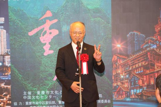 前日本駐重慶總領事、日中協會理事長瀨野清水用流利的中文致辭。他說:“重慶名字喜慶,好事不僅一個,最起碼有兩個,所以叫‘重慶’。中國唐代大詩人杜甫有詩云‘潤物細無聲’,觀光旅游就是能起到萬物入心的無聲作用。我對重慶非常懷念,有機會讓我們一起到重慶去吧!”