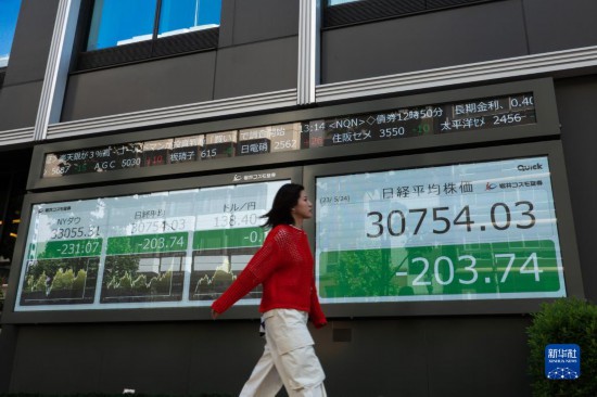 5月24日,行人走過日本東京街頭的證券實況看板。新華社記者 張笑宇 攝