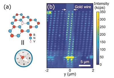 (a)六方氮化硼中的硼空位缺陷?瘴豢沙洚斢糜诖艌鰷y量的原子大小的量子傳感器,對磁場敏感,就像一個納米“磁針”。(b)量子傳感器納米陣列的光致發光可反應磁場的變化。