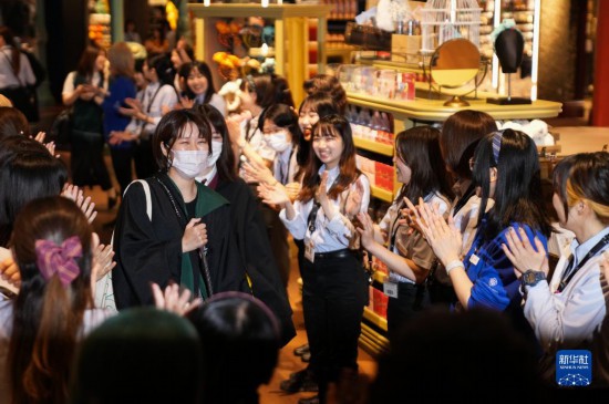 6月16日,在日本東京,哈利波特主題公園的工作人員歡迎游客。新華社記者 張笑宇 攝