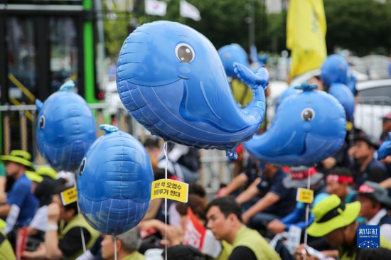 7月8日,民眾在韓國首爾參加集會,反對日本核污染水排海。韓國市民團體“阻止日本放射性污染水排海全國行動”8日舉行今年5月以來的第四次大規模集會。人們手持鯨魚模樣的藍色氣球,舉著“反對排放放射性核污染水”等標語,對日本政府不顧鄰國及國際社會擔憂執意推動核污染水排海計劃表示憤怒。新華社記者 王益亮 攝