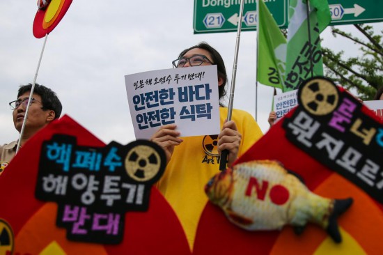 7月8日,民眾在韓國首爾手舉標語牌參加集會,反對日本核污染水排海。(新華社記者王益亮攝)
