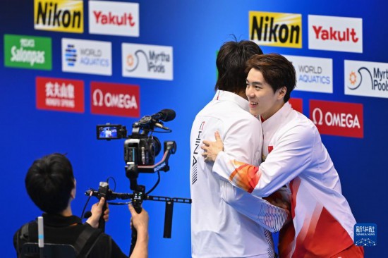7月26日,孫佳。ㄓ遥┡c覃海洋(中)在頒獎儀式上擁抱。新華社記者 張笑宇 攝