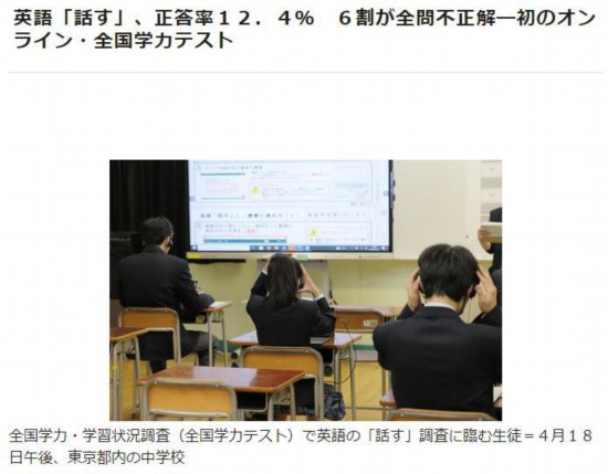 中新網8月1日電 據日本時事通訊社報道,7月31日,日本文部科學省公布了2023年度的全國學力學習情況調查,結果顯示,日本初三學生英語口語測試的正確回答率僅為12.4%。
