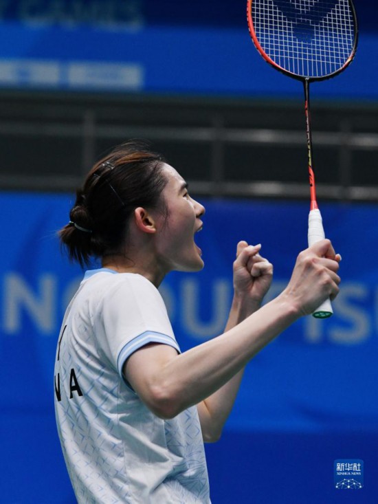 8月1日,中國隊選手韓悅在女單比賽中慶祝。新華社記者 張端 攝