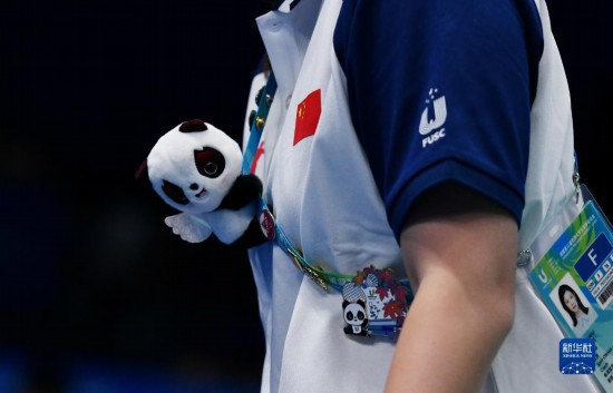 8月1日,中國隊教練李雪芮身前掛著成都大運會吉祥物“蓉寶”裝飾。新華社記者 張端 攝