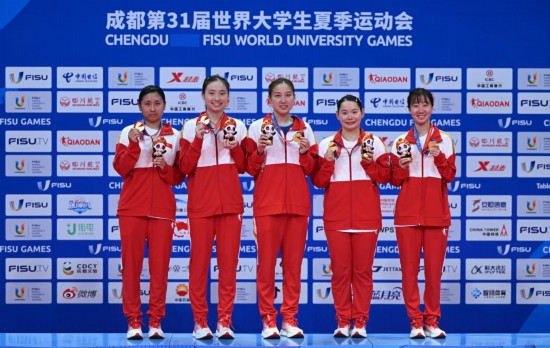 8月1日,中國隊選手楊詩璐、王曉彤、錢天一、何卓佳、趙尚(從左至右)在頒獎儀式上。新華社記者趙子碩攝