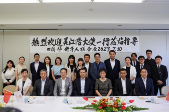 當天上午,吳江浩一行同四國華僑華人聯合會會長張嘉樹及華僑華人代表座談。吳江浩表示,華僑華人是祖國發展建設的重要力量,黨和國家始終高度關心廣大僑胞工作生活情況。中日友好根基在民間,希望四國地區華僑華人心懷祖國、融入當地,為兩國民間友好關系發展搭建更多橋梁。