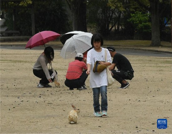 8月15日,游客在日本廣島縣竹原市的大久野島逗玩兔子。新華社記者 馮武勇 攝