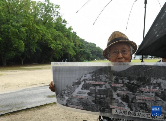 8月15日,在日本廣島縣竹原市大久野島,日本反戰人士、“毒氣島歷史研究所”事務局長山內正之展示當年侵華日軍在中國戰場使用毒氣彈的圖片資料。新華社記者 馮武勇 攝