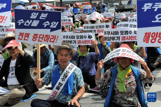 8月16日,在韓國全羅南道高興郡沿海一帶,韓國漁民手持標語參加集會活動,抗議日本核污染水排海計劃。新華社記者 周思雨 攝