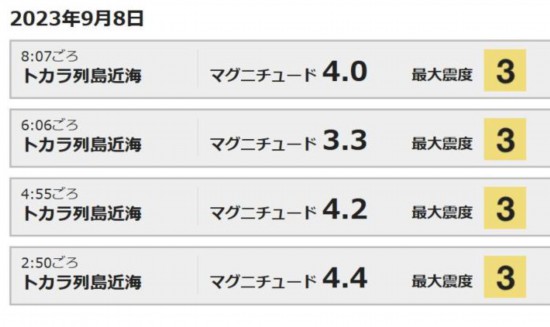 據報道,4次地震的震級分別為4.4級、4.2級、3.3級和4.0級,震中都位于鹿兒島縣吐噶喇列島附近,附近的土島村有明顯震感。