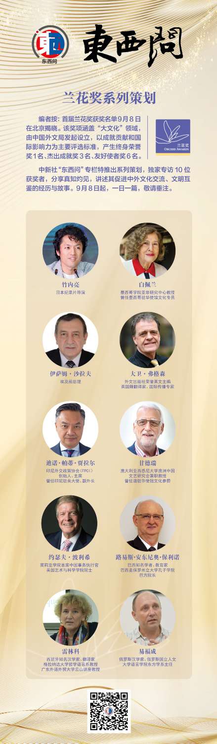 中新社“東西問”專欄特推出系列策劃,獨家專訪10位獲獎者,分享真知灼見,講述其促進中外文化交流、文明互鑒的經歷與故事。9月8日起,一日一篇,敬請垂注。