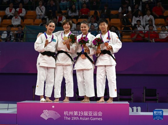 9月24日,冠軍日本選手角田夏實(左二)、亞軍哈薩克斯坦選手阿比芭·阿布扎基諾娃(左一)與并列季軍中國選手郭宗英(右一)、烏茲別克斯坦選手哈利馬忠·庫爾博諾瓦娃在賽后頒獎儀式上合影。新華社記者 李安 攝