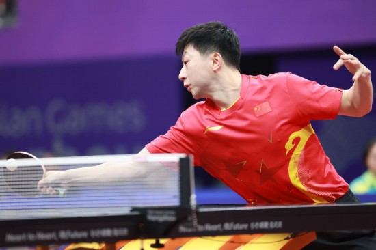 9月24日,中國隊選手馬龍在比賽中回球,他以3:0戰勝新加坡隊選手周哲宇。新華社記者 劉續 攝