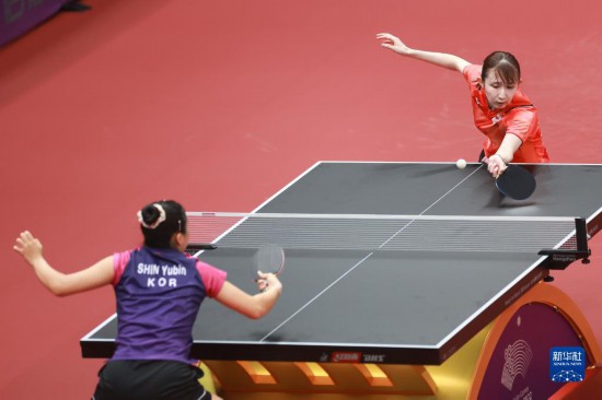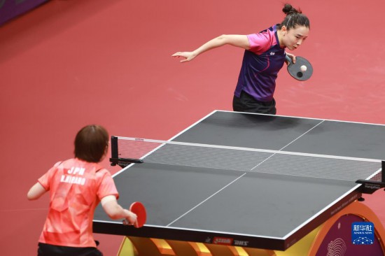 9月25日,日本隊選手早田希娜(右)在比賽中回球,她以3比0戰勝韓國隊選手申裕彬。新華社記者 劉續 攝
