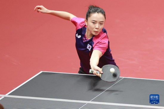9月25日,韓國隊選手田志希在比賽中回球,她以3比2戰勝日本隊選手平野美宇。新華社記者 劉續 攝