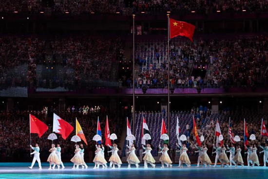 9月23日,各代表團旗手和禮儀志愿者在杭州亞運會開幕式上入場。新華社記者 李一博 攝