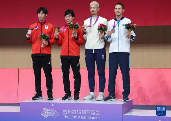 9月26日,冠軍日本選手加納虹輝(左二)、亞軍日本選手古俁圣(左一)和季軍中國香港選手何瑋桁(右二)、哈薩克斯坦選手埃爾米爾·阿利姆扎諾夫在領獎臺上合影。新華社記者 徐昱 攝