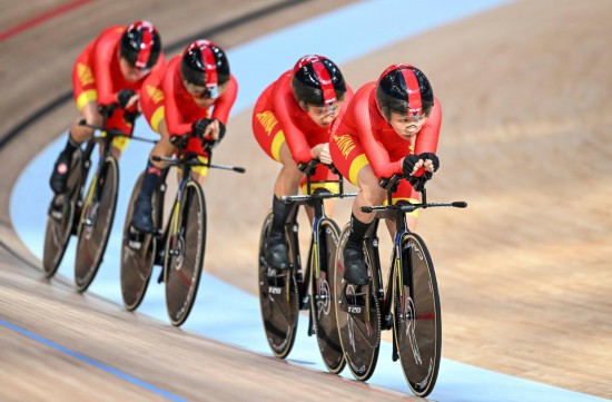 9月27日,中國隊選手在男子團體追逐賽決賽金牌賽中。新華社記者 胡虎虎 攝