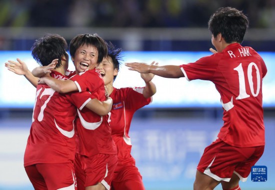10月6日,朝鮮隊球員金景英(左一)在比賽中進球后與隊友慶祝。新華社記者 賈浩成 攝