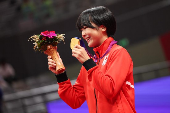 10月5日,日本選手藤波朱理在杭州亞運會女子自由式摔跤53公斤級比賽頒獎儀式上。新華社記者 吳壯 攝