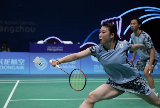 10月7日,渡邊勇大/東野有紗(左)在杭州亞運會羽毛球混雙決賽中。新華社記者 陳斌 攝