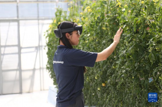 10月23日,在日本電信電話農業技術公司位于東京都調布市的“5G專網實證溫室”,工作人員借助智能眼鏡查看番茄生長狀況。新華社記者 錢錚 攝
