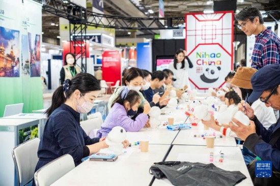 10月29日,游客在日本大阪國際會展中心中國館體驗為熊貓玩偶上色。新華社發(中國駐大阪旅游辦事處供圖)