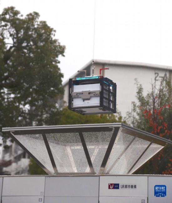 11月17日,在日本川崎市,空中索道機器人在面向媒體的試驗說明會上演示將商品放入取貨柜。新華社記者 錢錚 攝