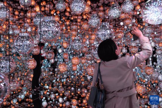11月20日,在日本東京“teamLab無界”美術館的媒體預覽活動上,一名參觀者拍攝藝術作品“泡泡宇宙”。新華社記者 涂一帆 攝