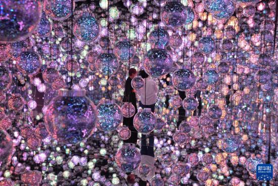 11月20日,在日本東京“teamLab無界”美術館的媒體預覽活動上,參觀者體驗藝術作品“泡泡宇宙”。新華社記者 涂一帆 攝