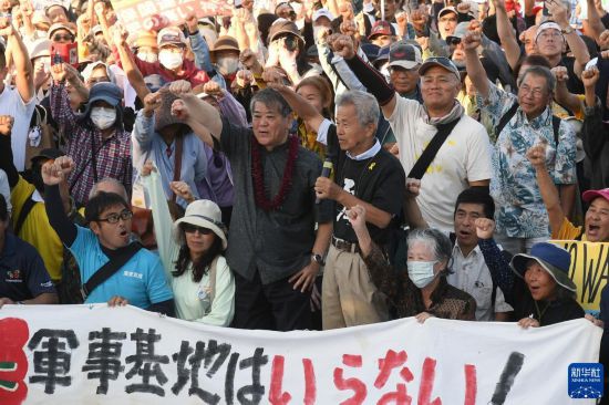 11月23日,在日本沖繩縣,民眾在集會上高呼口號。新華社記者 馮武勇 攝