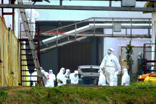 2004年2月29日,日本防疫人員在發生禽流感的京都府丹波町的養雞場內準備撲殺活雞。新華社記者馮武勇攝