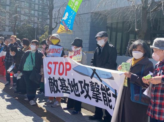 2月28日,在日本東京,日本民眾舉著標語牌抗議日本眾議院通過高額的防衛費預算案。新華社記者郭丹攝