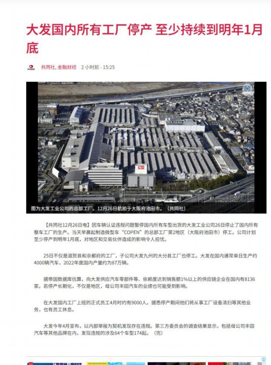 中新網12月26日電 據日本共同社報道,26日,豐田汽車子公司大發工業公司停止了日本國內所有整車工廠的生產,并計劃至少停產到明年1月底。4月時,在大發日本國內工廠上班的正式員工約有9000人。據悉,停產期間,他們將從事工廠設備清掃等其他業務,也有員工休息。大發曾在今年4月宣布,以內部舉報為契機,發現存在違規。第三方委員會的調查結果顯示,包括大發母公司豐田汽車等其他品牌在內,發現了174項違規,涉及64款車型。(中新財經)